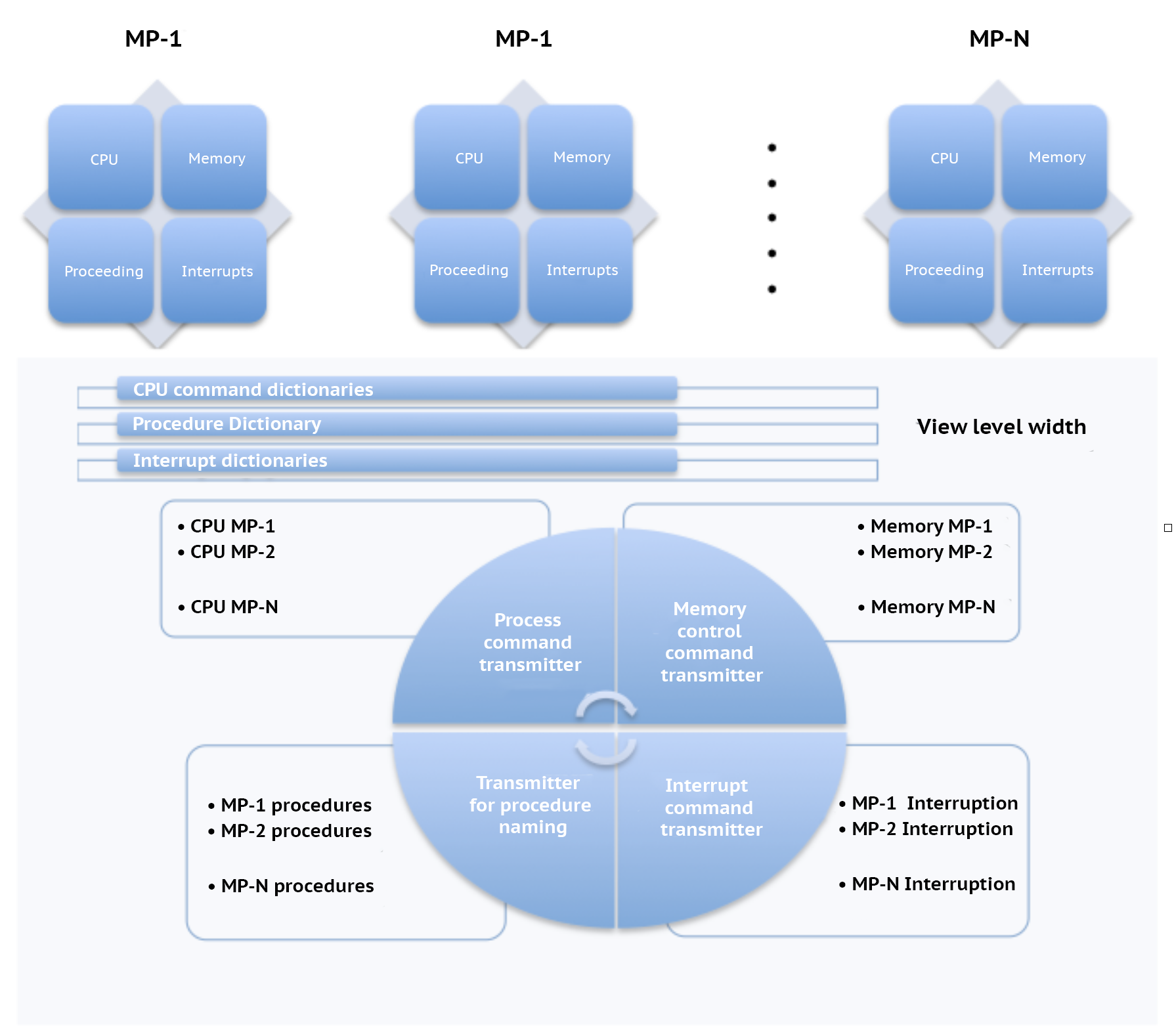 The picture shows the architecture of information exchange of interprocessor command exchange and control system. Interaction between microcontrollers (processors) takes place on three buses of representations: commands of processors, procedures and interrupts, and the translator mechanism between microprocessors is the same for all microprocessors.